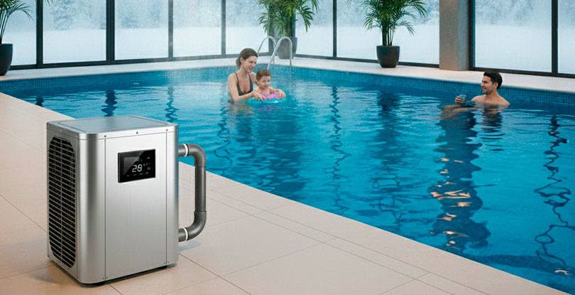 Las bombas de calor son, sin duda, una de las soluciones más eficientes para climatizar una piscina cubierta. Su funcionamiento es similar al de un aire acondicionado: captan hasta el 80 % de la energía del aire exterior y la transforman en calor para calentar el agua.