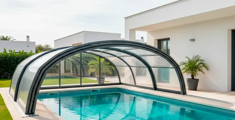 Un equilibrio ideal entre comodidad y estética. Su mayor espacio interior permite acceder a la piscina sin necesidad de abrir por completo la estructura, lo que prolonga la temporada de baño y mejora la experiencia de uso en cualquier clima.